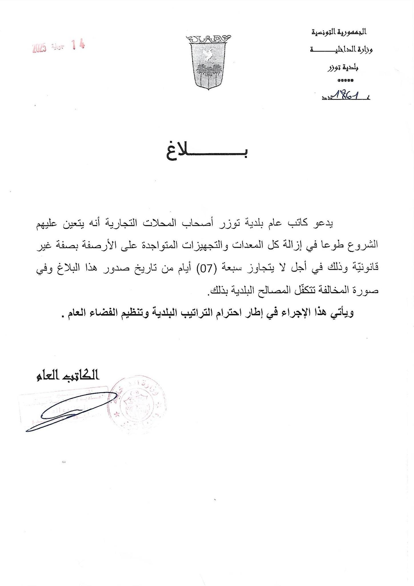 بلاغ الى كافة التجار بمنطقة البلدية بتوزر
