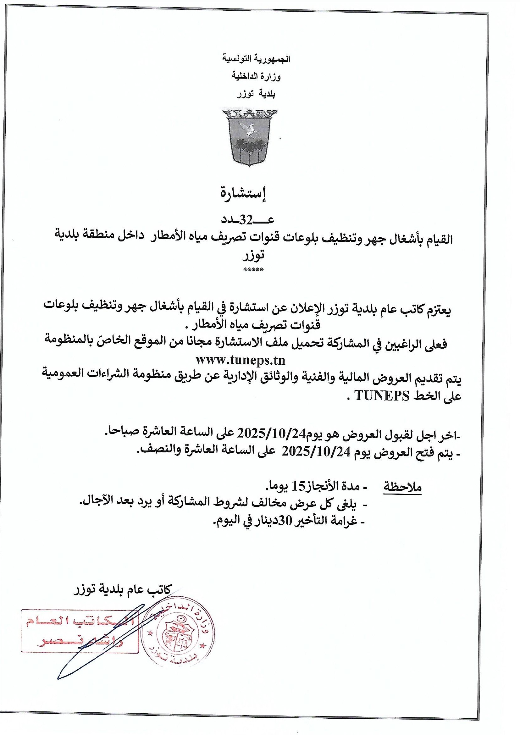 استشارة عدد 32 للقيام باشغال جهر وتنظيف بالوعات قنوات تصريف مياه الامطار داخل منطقة بلدية توزر