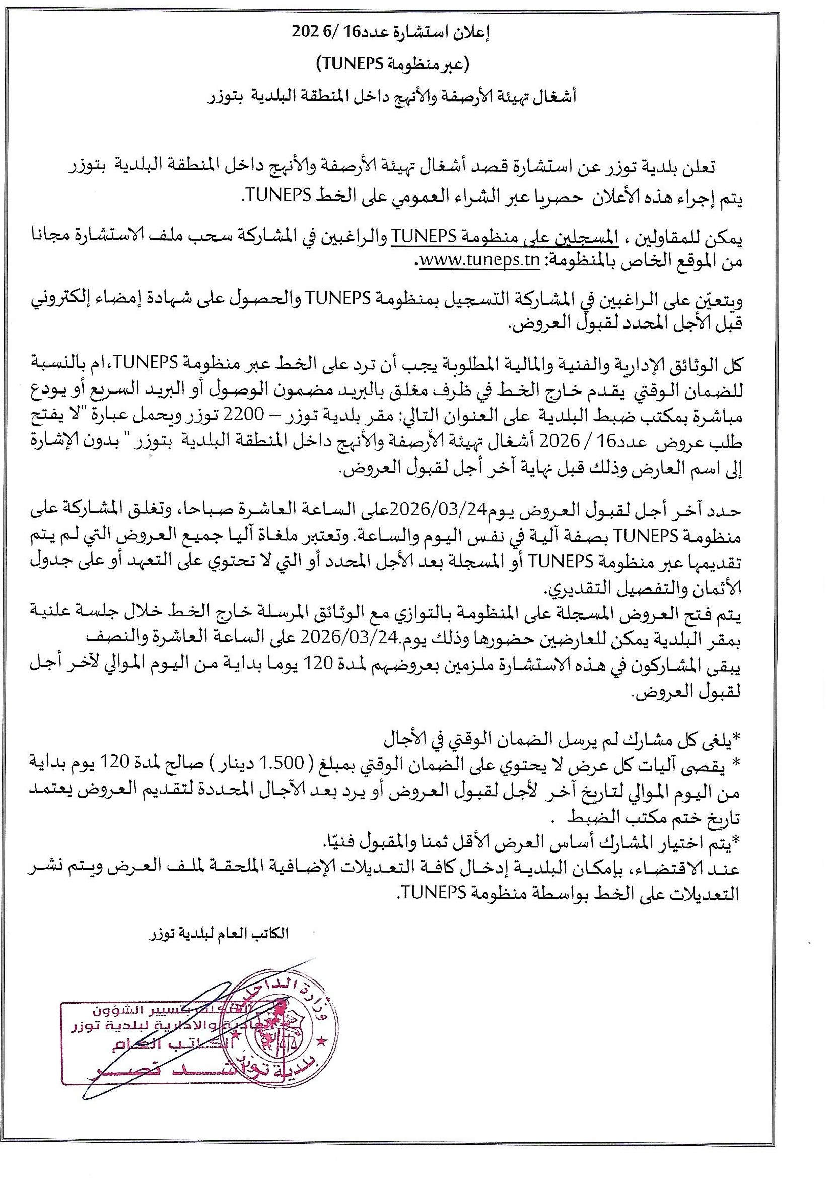 استشارة عدد 2026/16 (عبر منظومة tuneps) اشغال تهيئة الارصفة والانهج داخل المنطقة البلدية بتوزر